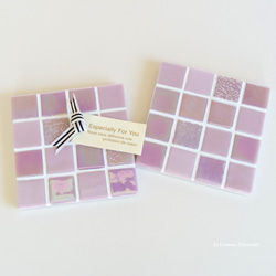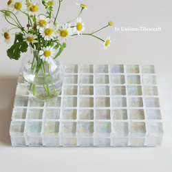 発色の美しいガラスタイルや、 味わい深い天然石タイル、さまざまな高級モザイクタイルだけを使い、ディスプレイ用のトレイやコースターなどを制作中です。