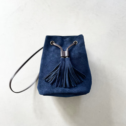 這款圓形手提包採用牛絨面革和加厚油鞣皮革製成。
