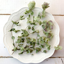 実の部分がかなり大きめなので、リーフの向きがバラバラだったりもするのですが、その形が面白く、作品を撮影する時の背景においても映えるドライグリーン素材。
