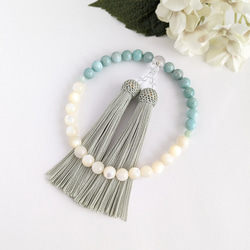 ホワイト,ライトグレー,グレーと、真珠の色味を階調(グラデーション)に配した略式数珠です。