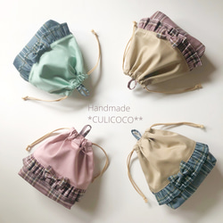 ナップサック型 体操服入れ くすみピンク×タータンチェック フリル♡リボン お着替え袋 女の子 大きめ