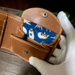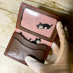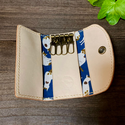 全て手縫いの、はちわれ猫の本革キーケースです。シルバー色のキーホルダーは4連。根本を指で押さえてロックを外し、回転させると鍵の着脱ができます。