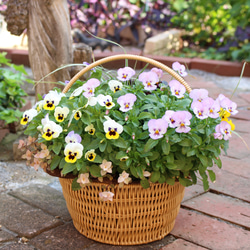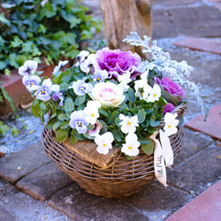 自然の秋風を感じさせる、花々や実物あふれる籠のアレンジメントです。