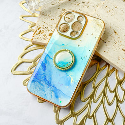 マーメイドカラー ブルー×グリーン ニュアンスライン入りスマホケース アルコールインクアート アクアブルーミントグリーン