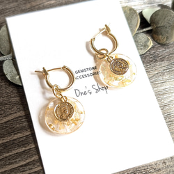 純金箔とラメを添えたオルゴナイトの水滴型ピアスと