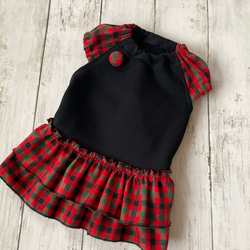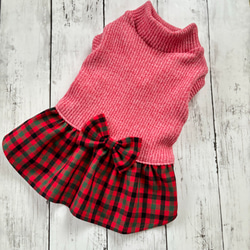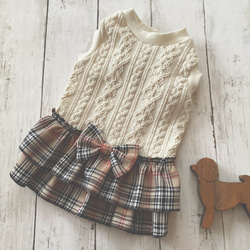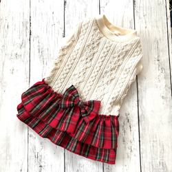 犬服 受注制作 赤のアラン風ニット、赤チェックの2段フリルスカート