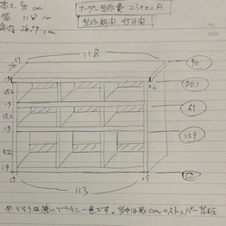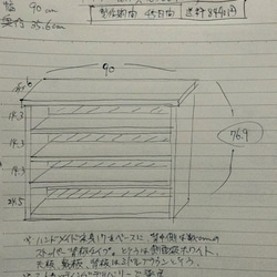 外寸は高さ79.7cm、横幅90cm、奥行き35cm。脚10cm、各段高さ32cm。黒っぽいブラウンで塗装した2段のシェルフタイプのラックです。出品画像はオーダースケッチとベースになった家具の写真になります。