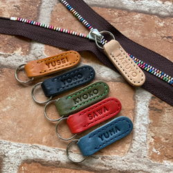 栃木レザーヌメ革(2cm×7cm)を表裏2枚貼り合わせて約3.5mmの厚みのキーホルダーです。