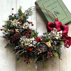 所々に忍ばせて落ち着いた色合いのリースになりました。