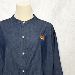 女士印花貓咪刺繡淺藍色肩領長袖襯衫,可愛又時尚。