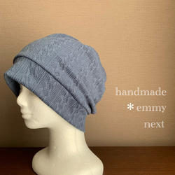チャコールグレーのアラン風ニット生地を使い、手の込んだワッチキャップにしました。