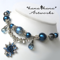 ブルー系の石やクリアビーズを繋げた縦ラインのロングネックレスです。