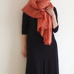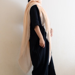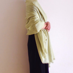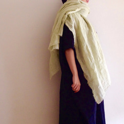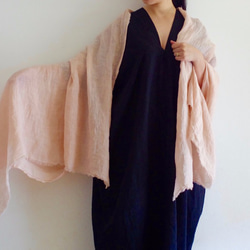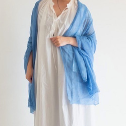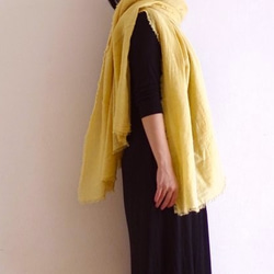 這條披肩採用大量細亞麻線編織而成的布料,並用天然染料染色。