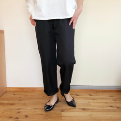 光沢があり、程よいハリのある生地で作った楽な着心地のチノパンツ。