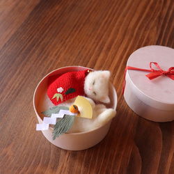 羊毛1匹★ネコ鏡もち丸箱13㎝、和紙☆送料500円