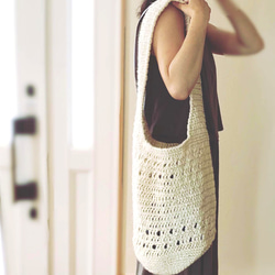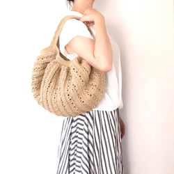 シンプルな服にも合うように、底から肩紐まで全て同じ編み方で統一感を出しました。