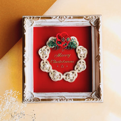 フレームが豪華で作品をより引き立てたものになっていると思いました。リースはグリーンのものが多いですが、あえて白を選びましたが、ジュエリーっぽいエレガントさもある作品だと思います。