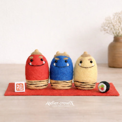 想像していたのより、やや小さいめでした。アトリエクラウンさんには、大きめのものがあることが分かり少し後悔でしたが、黄色の鬼も購入したかったので大きさのことは考えず、こちらから購入してしまいました。飾ってみると、恵方巻き三本と屏風をつけたことで、存在感も出ましたので、これで十分かなとも思っています。あえて言うなら、トリオと恵方巻き飾り用として少し余裕が出るような敷物や屏風にしてもらえると良いのかなと思います。大きさも2体のもののように明記してもらえると分かりやすいと思います。