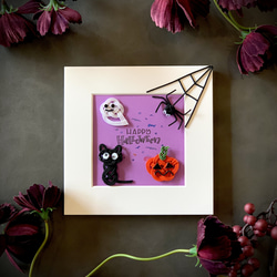 ハロウィンといえば、オバケやカボチャが浮かびますが、黒猫と蜘蛛がよりメインを引き立てた作品だなと思いました。置物はいくつかありますが、フレームは珍しいのでこの作品に出会ってよかったです。