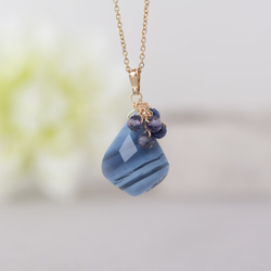 ストライプ柄のブルーオパールを探しており、やっと好みの模様のものに出会えた!と思い購入いたしました。添えられたアイオライトなどのビーズもキラキラで、落ち着いたトーンで纏めたシックな雰囲気がとても気に入っています。