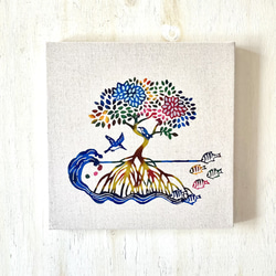 海か沖縄をイメージさせる写真や絵のパネルを探していたところ、昔、紅型で描かれたジンベイザメだったかクジラだったかの壁飾りを見て、心奪われたことを思い出して検索。海とは少し違いますが、汽水に生息するマングローブと生き物達がすっきりと、でも色鮮やかに描かれた世界に一目惚れしてしまいました。早速当ててみましたが、緑がかった濃い青の壁紙によく合います!選んで良かったです♪